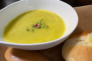 ■4/鍋にバターを溶かして玉ねぎを炒め、ケールとグリーンピースを炒めます。